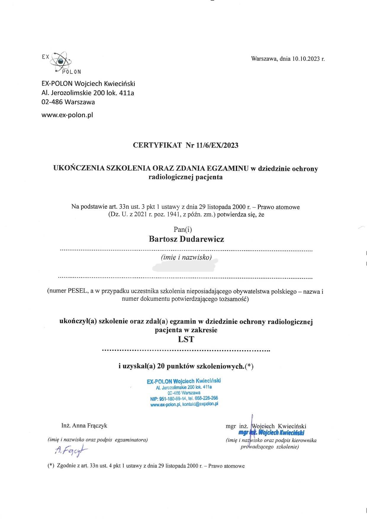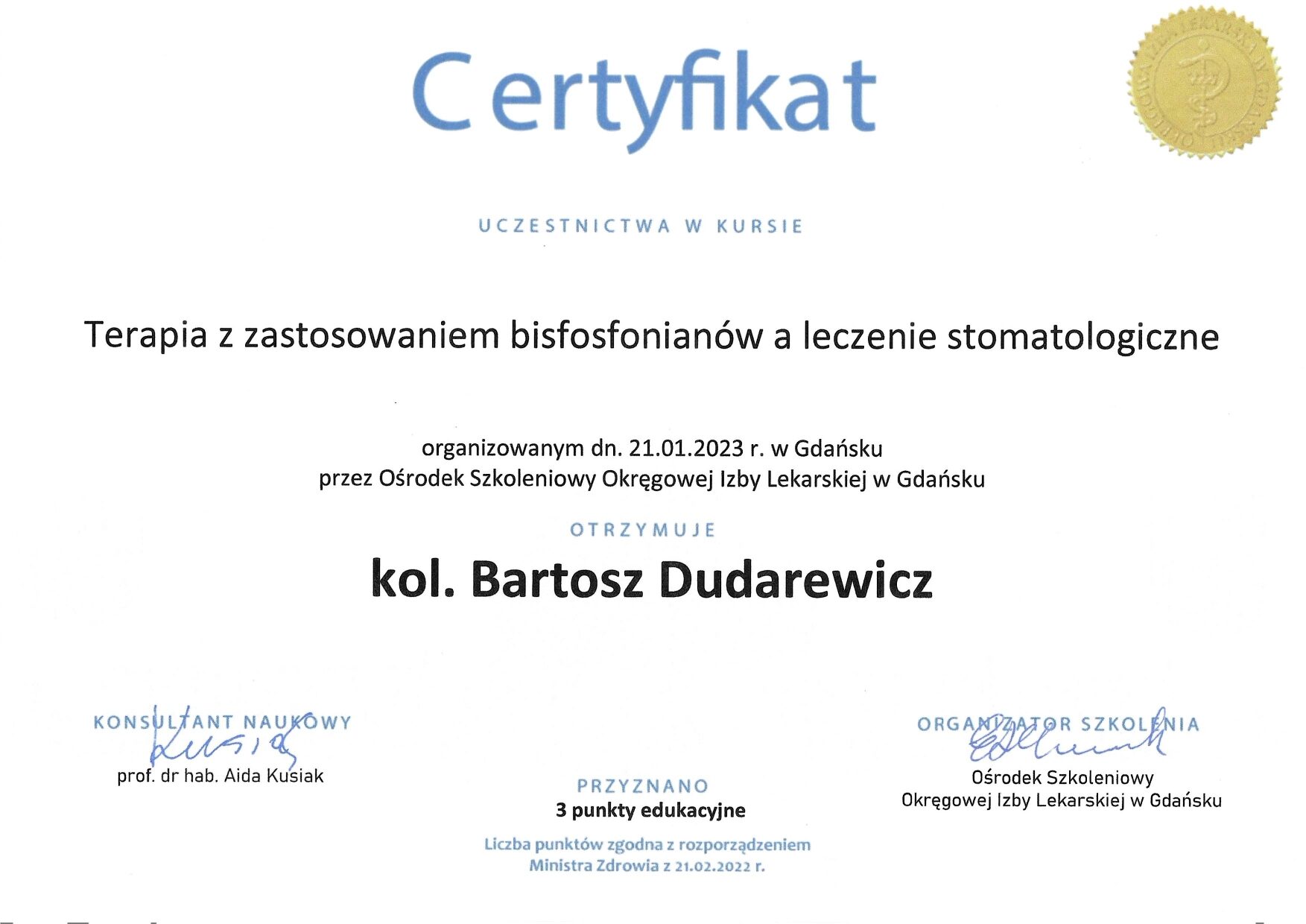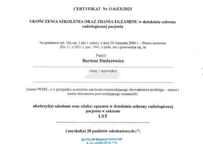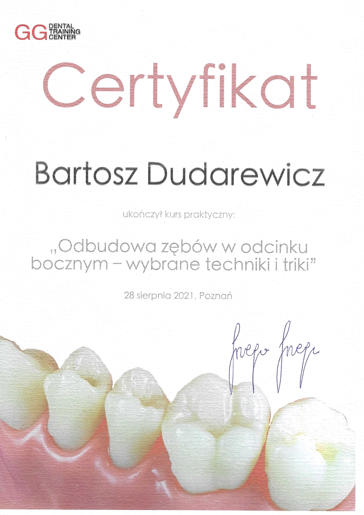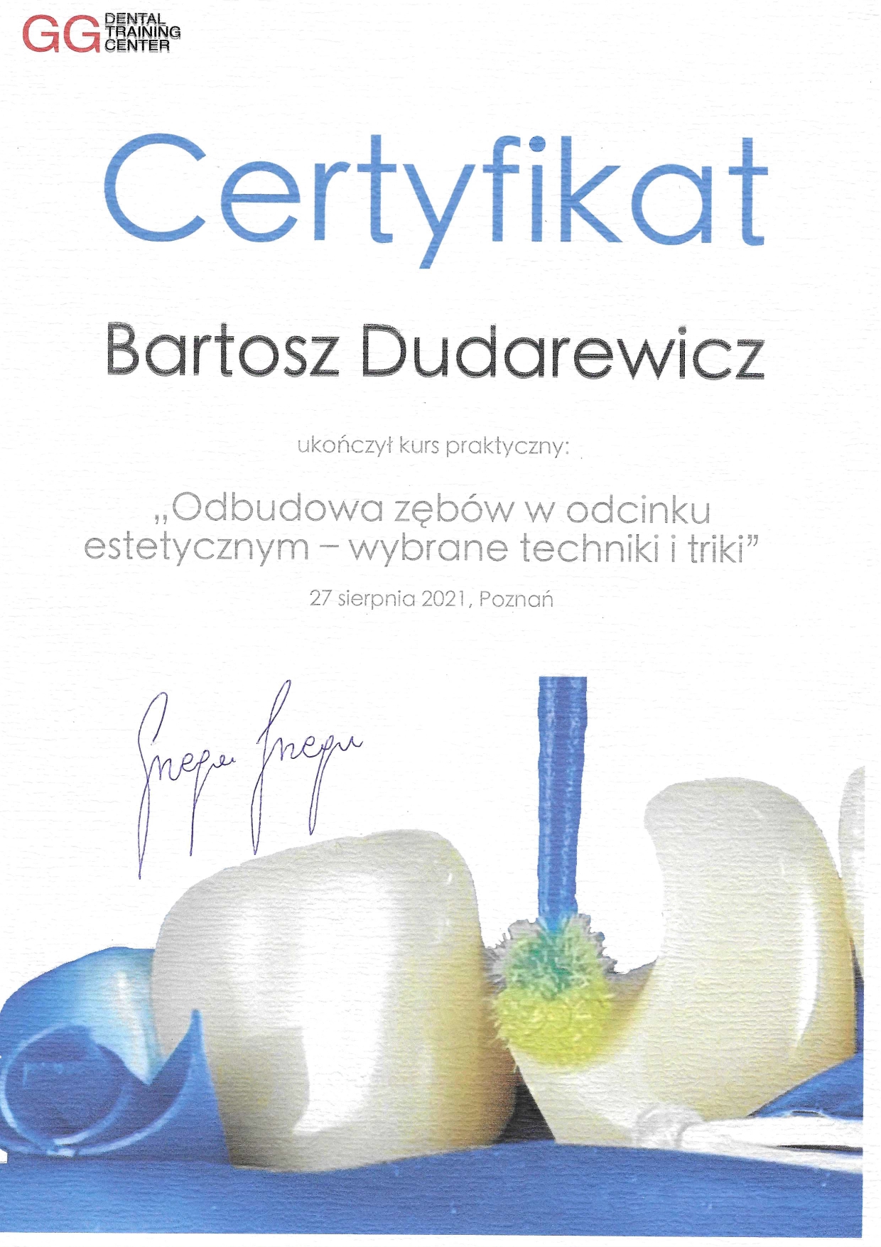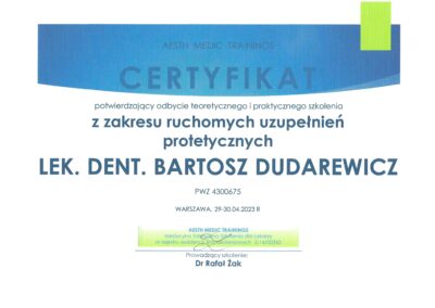 Stale poszerza swoje umiejętności uczestnicząc w licznych kursach i webinarach. Aktualnie jest w trakcie specjalizacji w zakresie protetyki stomatologicznej.